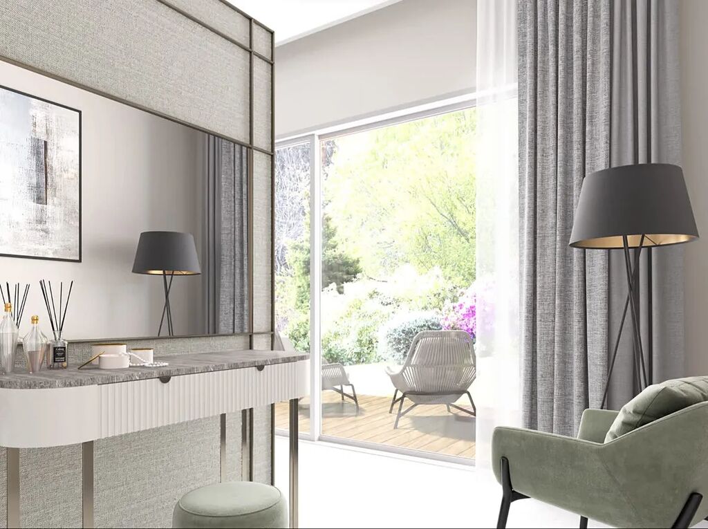 Byt vyniká příjemnou orientací s dostatkem denního světla, velkoformátovými francouzskými okny a moderním interiérem v přírodních tónech.