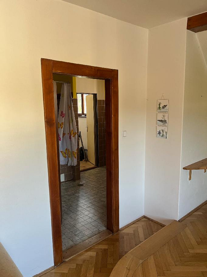 V podkroví jsou 2 pokoje, koupelna s vanou, WC, komora v části i půda.
