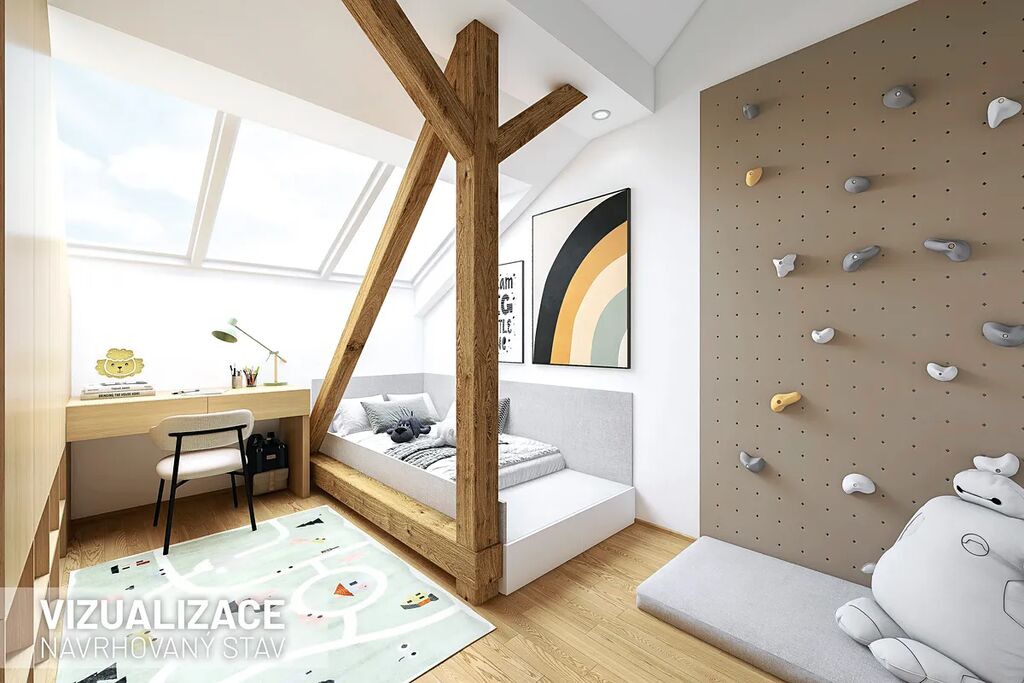 Vstoupíte – a okamžitě víte, že tento byt je jiný. Vysoké stropy, masivní trámy a světlo proudící střešními okny vytvářejí jedinečný prostor s duší. Když k tomu přidáte soukromou terasu, je jasné, že tohle je bydlení, které se nevidí každý den.