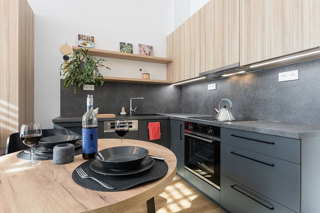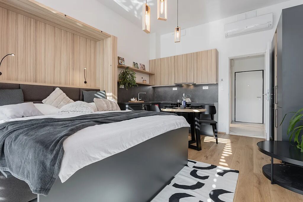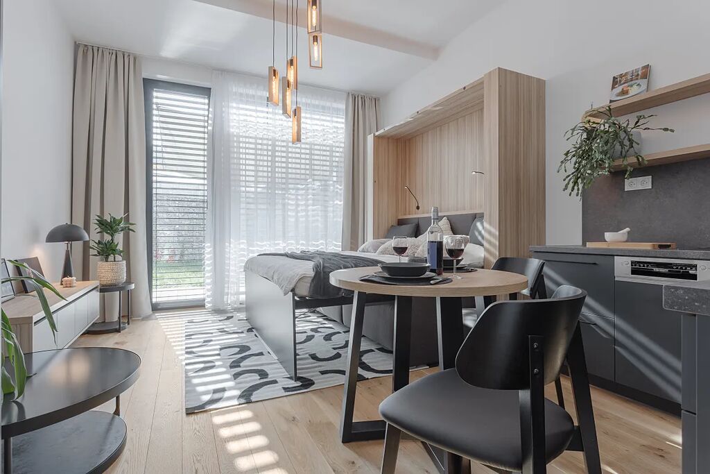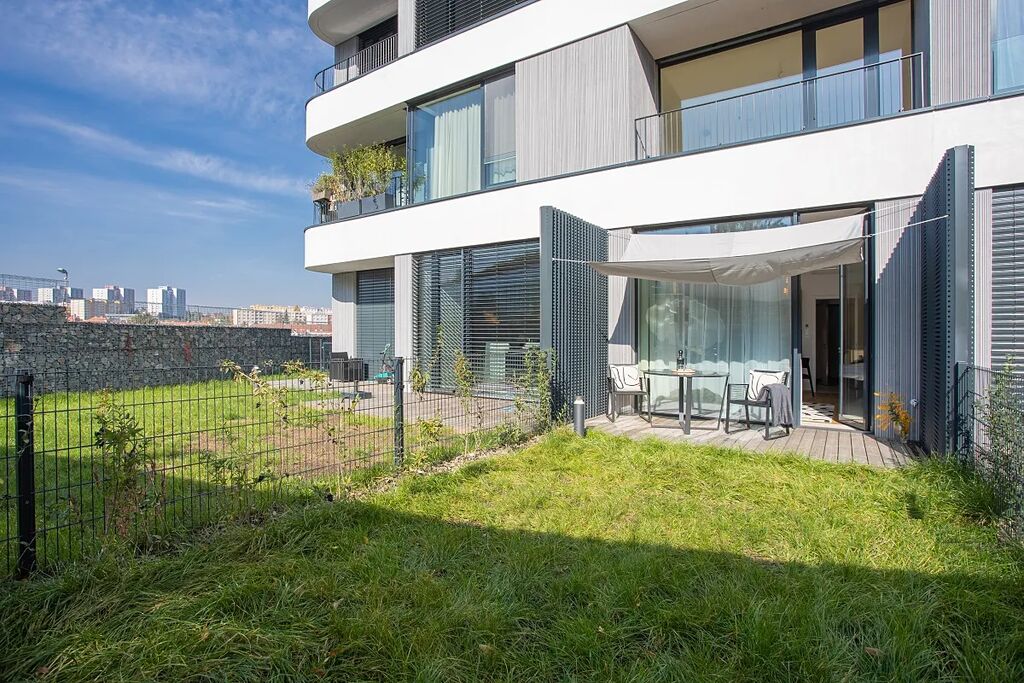 Byt je plně vybavený, dokončený 10/2022. Obývací pokoj/ložnice má velké francouzské okno, automatické předokenní žaluzie, terasu a zahrádku. Byt je zařízený na míru. V kuchyni jsou vestavěné spotřebiče - lednice, myčka, horkovzdušná trouba a indukční varná deska. Obývací pokoj je prakticky zařízen sklopnou pohodlnou postelí, sedačkou, stolky, skříněmi s úložným prostorem.