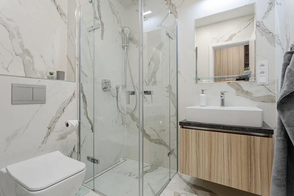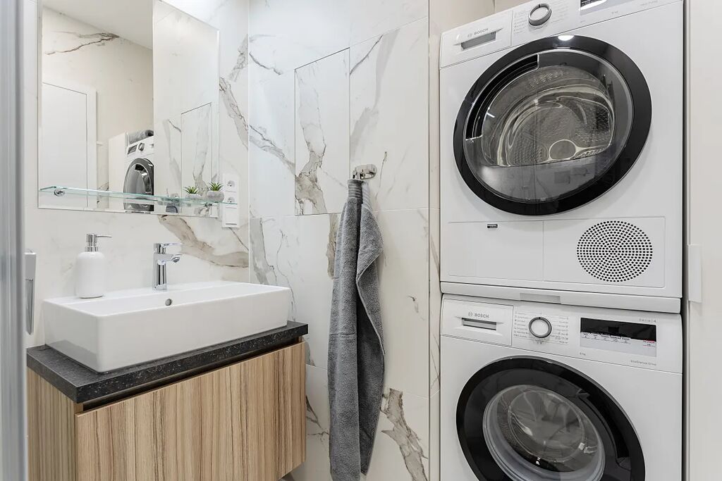Koupelna je se sprchovým koutem, toaletou, pračkou a sušičkou.