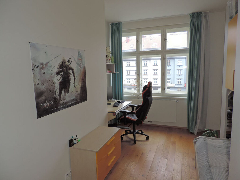 Moderní byt se nachází ve 3. patře zrekonstruovaného domu s výtahem v centru Dejvic a sestává ze tří samostatných pokojů (25,4m²+17,8m²+15,6m²) a vybavené kuchyně (8m²), dále je součástí bytu chodba, koupelna se sprchovacím koutem a samostatné WC. K bytu náleží sklepní kóje (2,7m²) v suterénu domu.