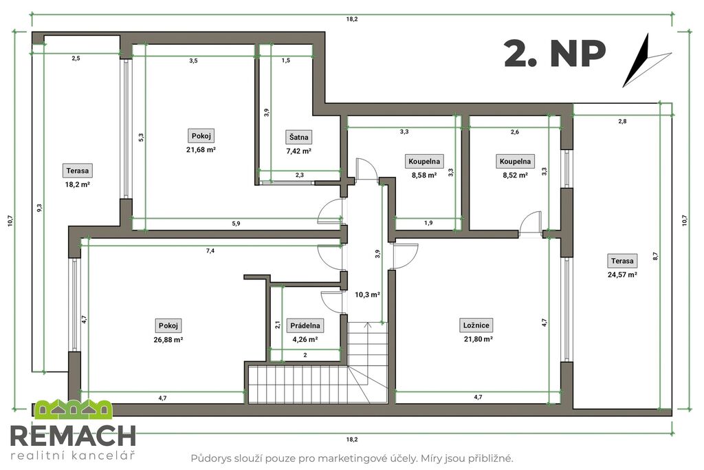 • přední terasa 18 m² (přístupná ze dvou pokojů)