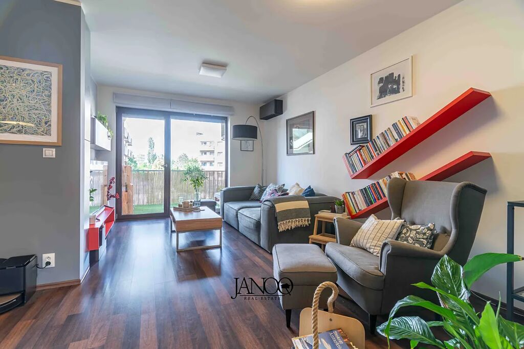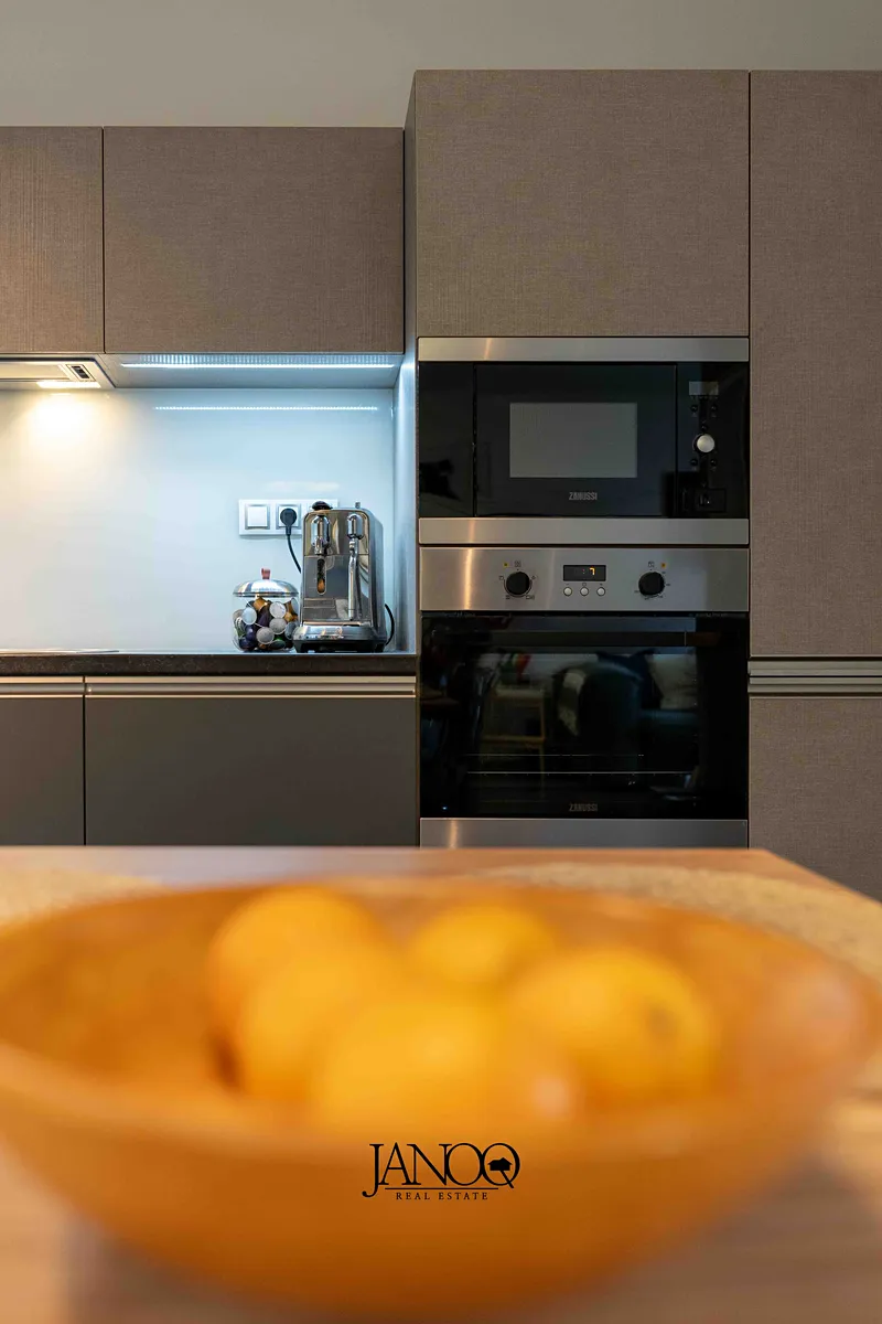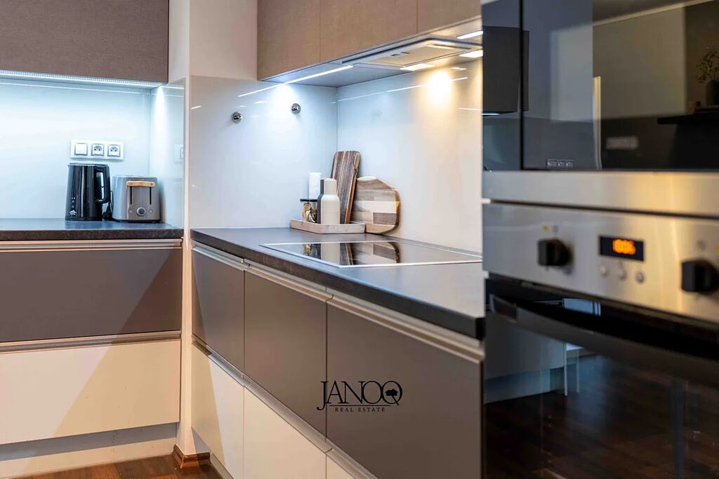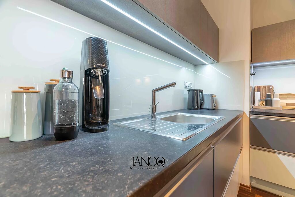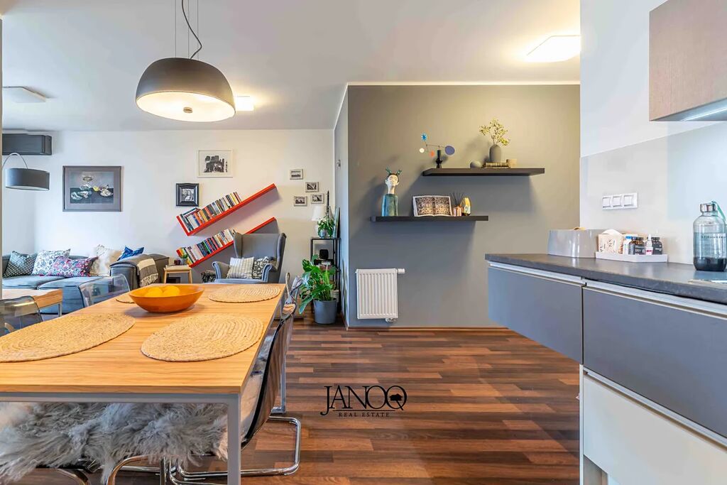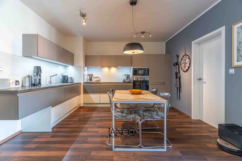 Podlahy jsou kombinací plovoucích podlah a keramické dlažby. Vytápění je dálkové. Kvalitní kuchyně je dělaná na míru a obsahuje vestavěné spotřebiče včetně myčky. V obýváku je klimatizace, která se postará o vychlazení většiny bytu a v zimě slouží jako úsporná varianta topení. V bytě je i optický internet 1Gb/s.