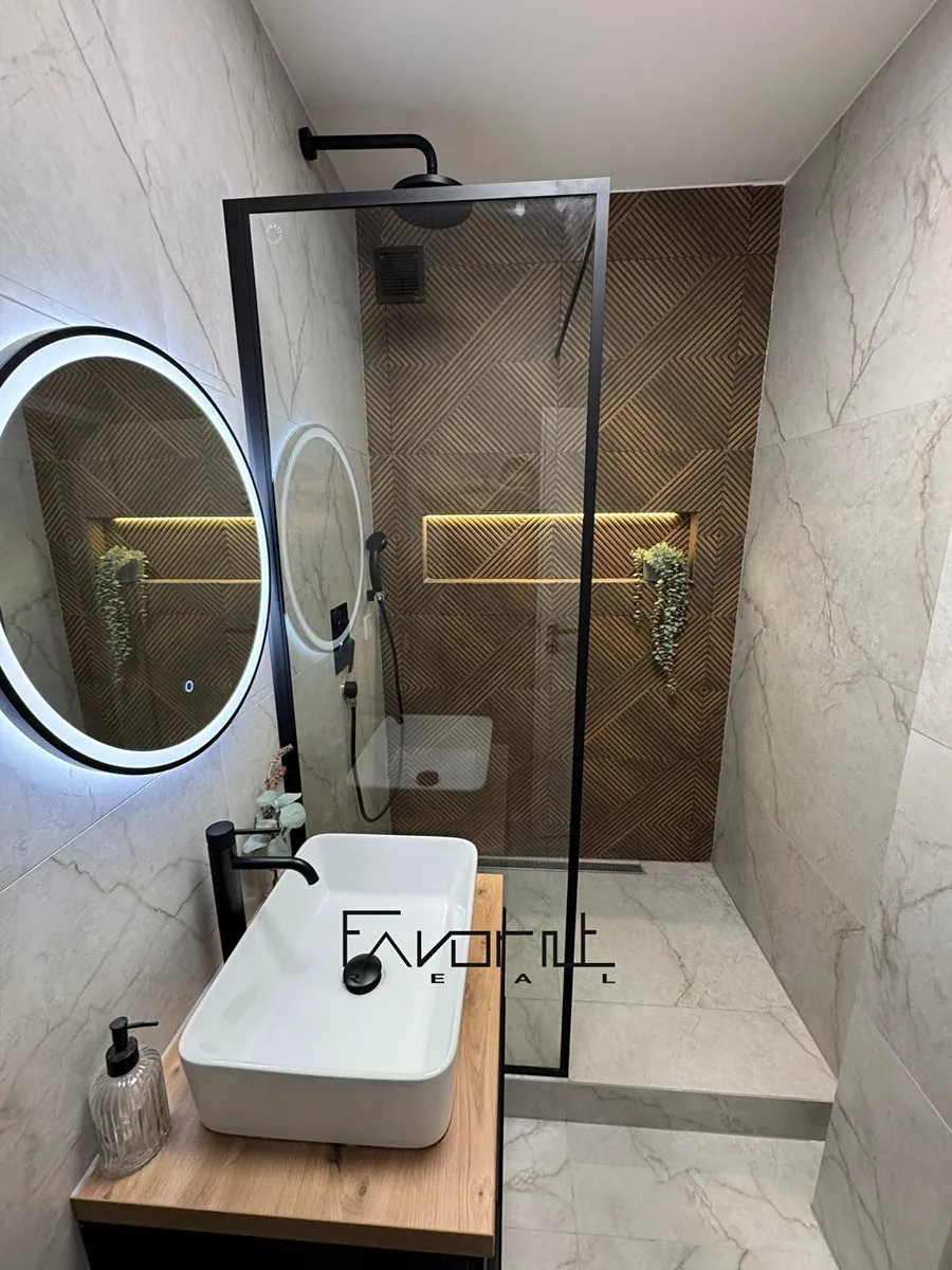 • Koupelna s novými obklady, dlažbou, sprchovým koutem, umyvadlem se skříňkou, zrcadlem, bateriemi a WC.