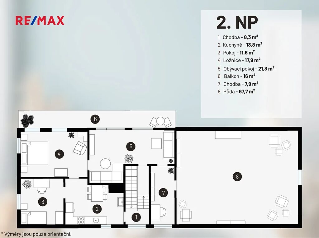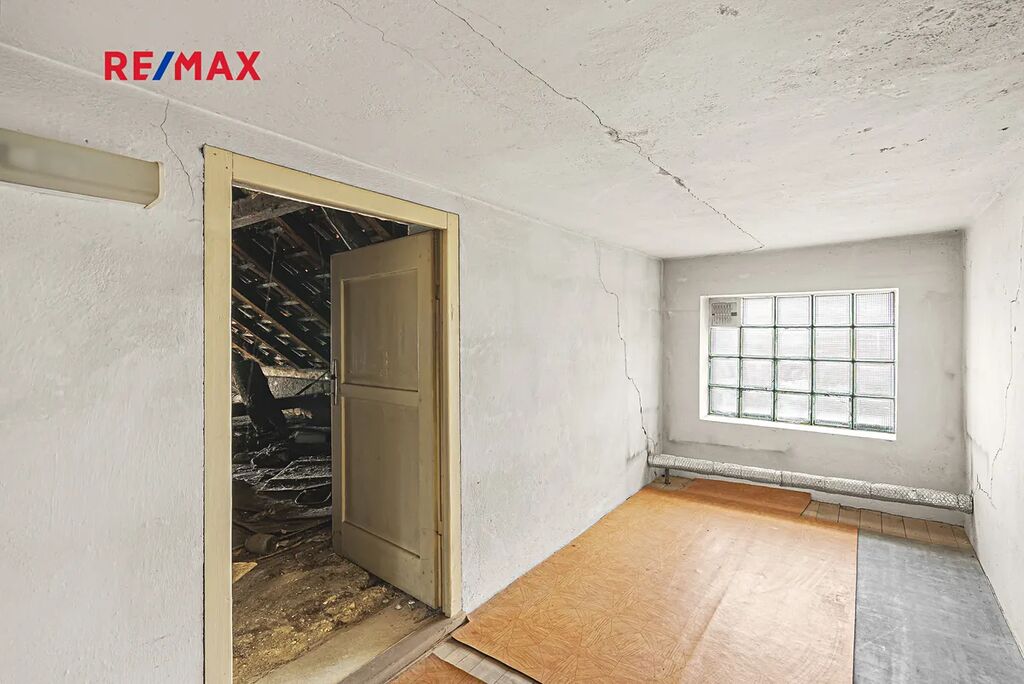 • Chodba, kuchyň, pokoj, ložnice, obývací pokoj, balkon, chodba, prostorná půda, která lze předělat na další obytnou část.