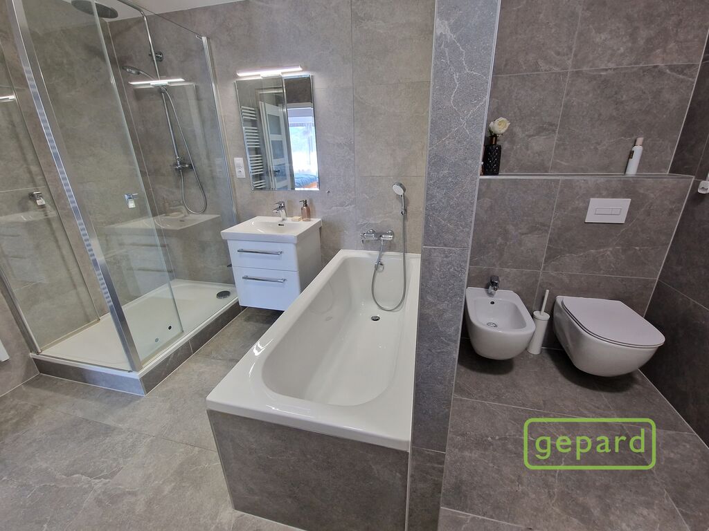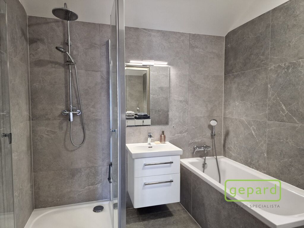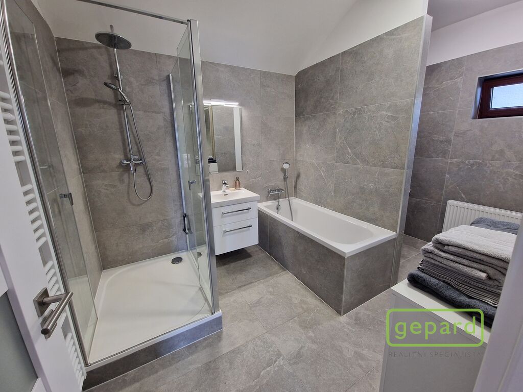 První patro: tři ložnice, z toho jedna se šatnou, koupelna se sprchovým koutem, vanou a WC s bidetem. Prakticky zabudovaná pračka se sušičkou zajišťuje pohodlí i pro větší rodinu. Koupelny jsou provedeny v moderním stylu Elements, který interiéru dodává eleganci, čistý design a nadčasový vzhled.