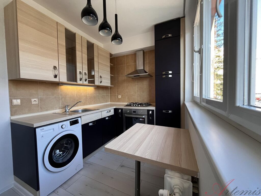 Moderní rohová kuchyňská linka je vybavena vestavěnými spotřebiči - elektrická trouba, plynová varná deska, digestoř, pračka. V ložnici se nachází velká vestavěná skříň, která nabízí spoustu úložného prostoru jak pro oblečení, tak úklidové náčiní. V prostorné předsíni je dostatek místa pro další vestavěnou skříň či předsíňovou stěnu. V celém bytě jsou nové interiérové dveře s obložkovými zárubněmi a bezpečnostními vstupními dveřmi.
