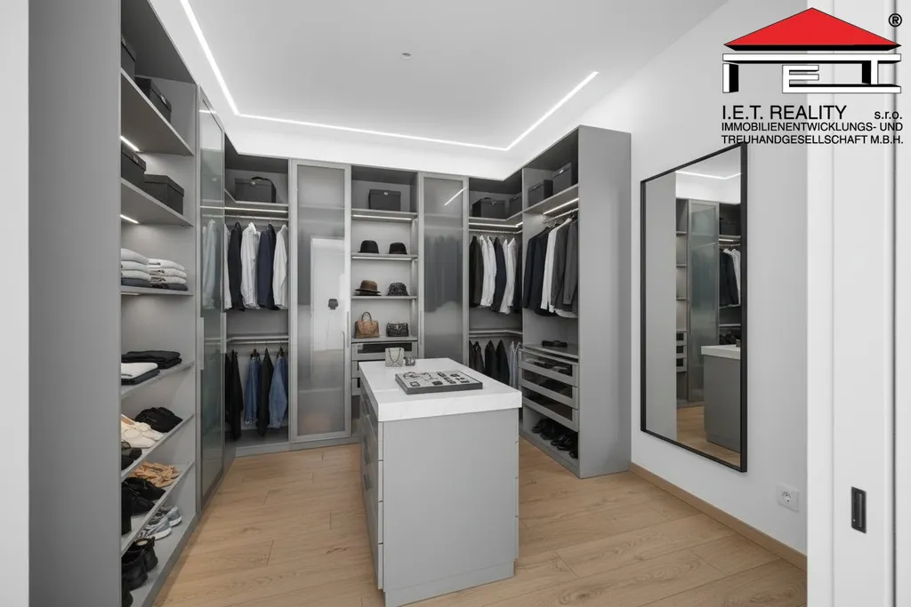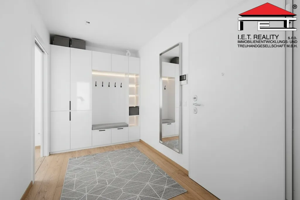Z předsíně je vstup do samostatného pokoje (šatna, pokoj pro hosty, dětský pokoj) a toaletu. Hlavní obytnou část tvoří světlý obývací pokoj s nadčasovou kuchyňskou linkou s vestavnými spotřebiči. Dále z tohoto pokoje je přímý vstup na prostornou terasu, s výhledem do vnitrobloku. Z obývací části je zároveň vstup i do komfortní hlavní ložnice, která disponuje vlastní koupelnou a šatnou. Některé z fotografií jsou pouze ilustrační vizualizace pro lepší představu o možném uspořádání interiéru.
