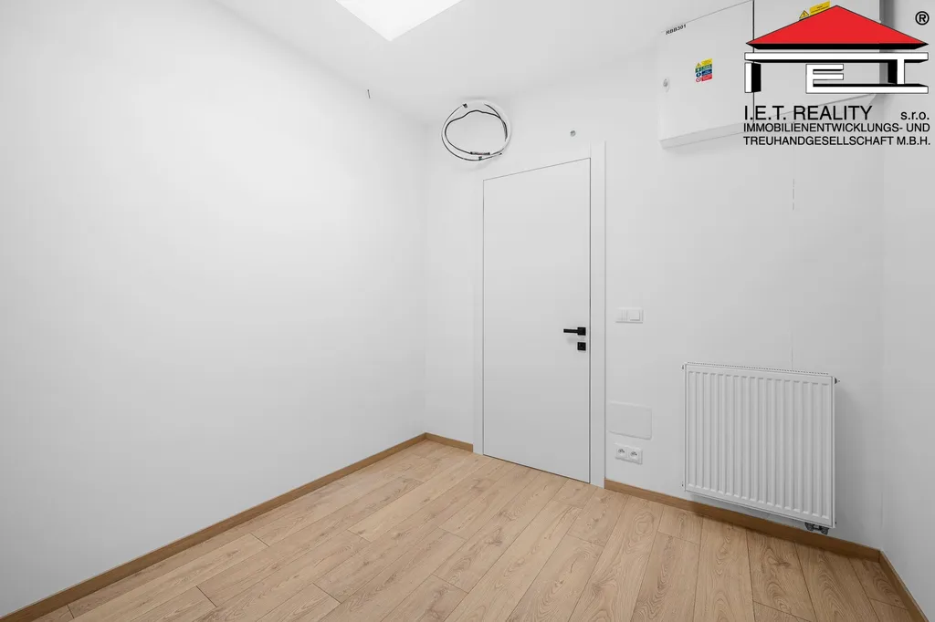 Topení v ložnici a obývacím pokoji pomocí fan Coil jednotek, příprava pro chytrou domácnost pomocí dálkového ovládání, střešní světlík v menším pokoji s dálkovým ovládáním, kuchyňská linka s kamennou deskou Technistone.