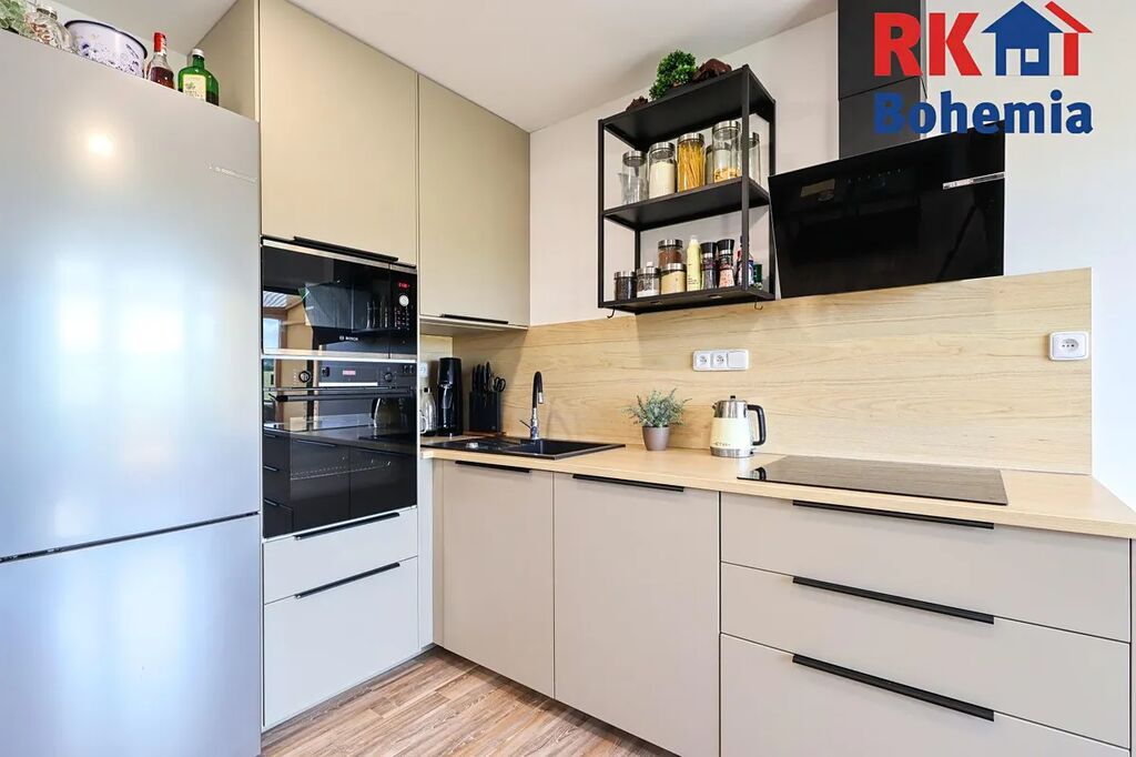 Součástí kuchyňské linky jsou vestavěné spotřebiče (el. trouba, mikrovlnná trouba, indukční varná deska, myčka) a digestoř. V koupelně je umístěna rohová vana se zástěnou, umyvadlo se skříňkou, WC a příprava na pračku.
