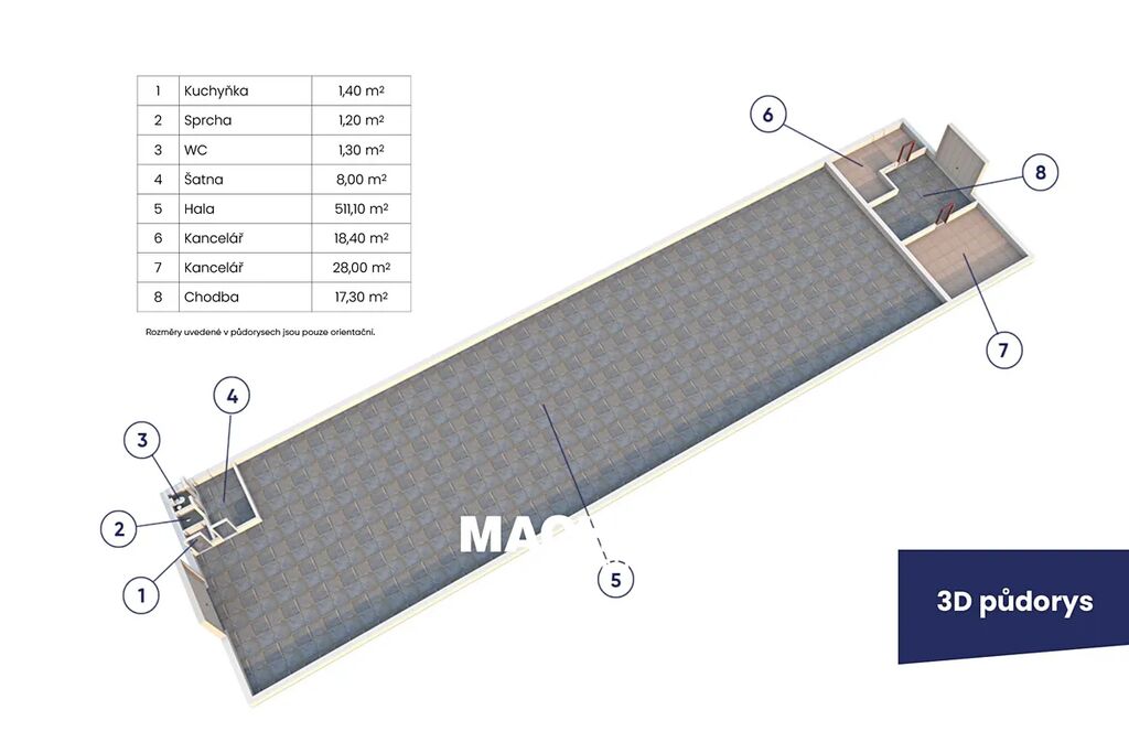 Prostor je ideální pro skladování, lehkou výrobu, e-shop logistiku nebo jako zázemí pro firmu.