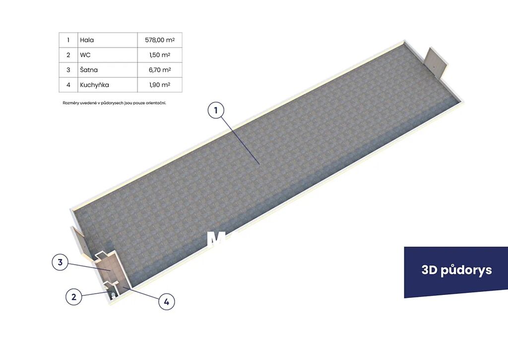 Nabízíme k pronájmu skladovací halu o rozměrech 49 × 12 metrů, tedy o celkové ploše 588 m².