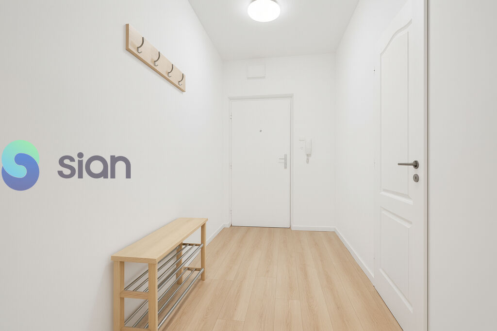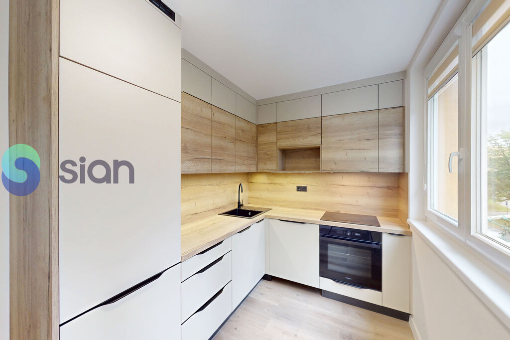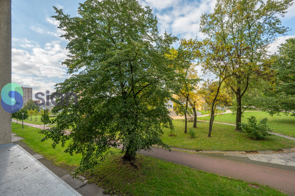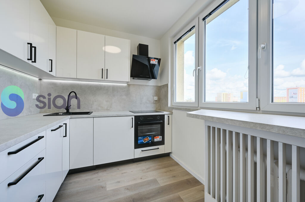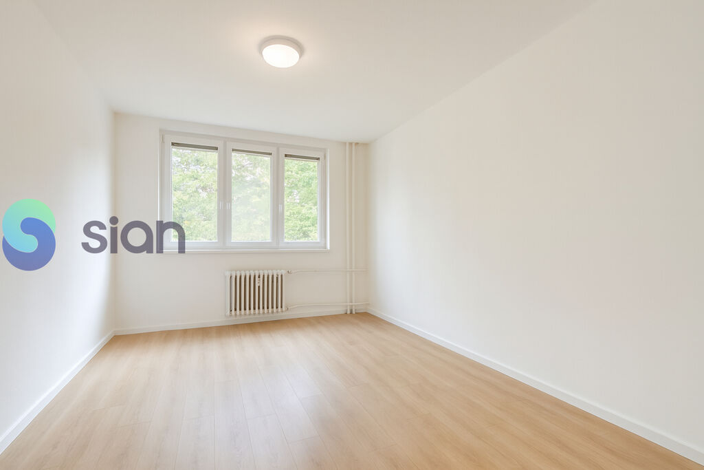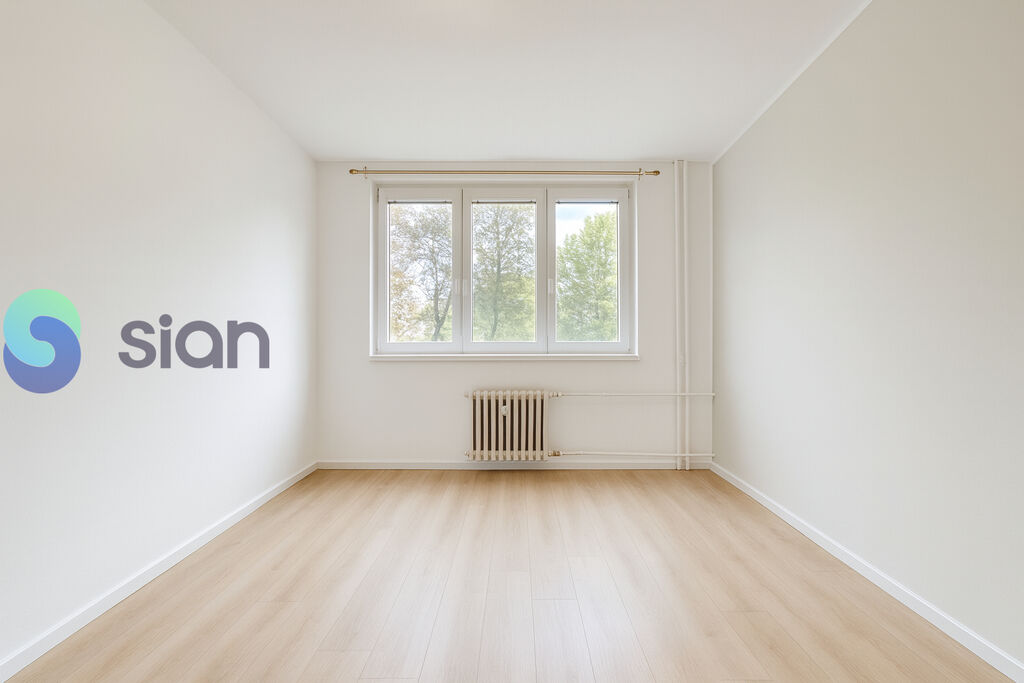 Díky oknům orientovaným na obě světové strany je byt světlý a nabízí příjemný výhled do zeleně.