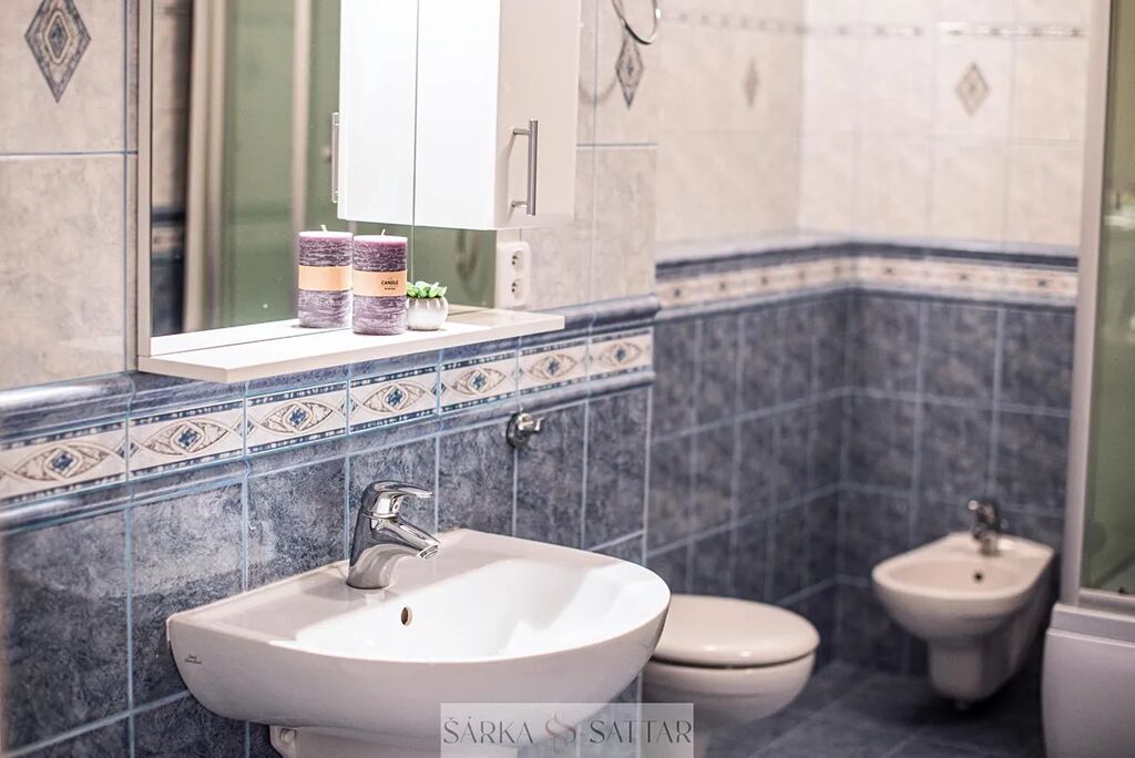 Obě ložnice jsou orientovány do klidného vnitrobloku a mohou sloužit také jako pracovna či dětský pokoj. V bytě se dále nachází velká koupelna s vanou, masážní sprchou, toaletou, bidetem, umyvadlem a pračkou AEG. Druhá toaleta s umyvadlem je samostně přístupná z haly. V hale a v ložnicích jsou vestavěné skříně, na podlahách jsou dřevěné parkety a dlažba. Okna jsou špaletová , vytápění plynovým kondenzačním kotlem Vaillant.