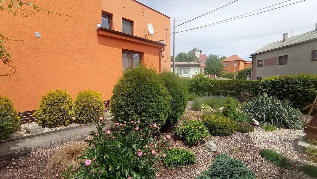 K domu také patří rozlehlá zahrada a vkusně navržená předzahrádka se vzrostlými keři a květinami.