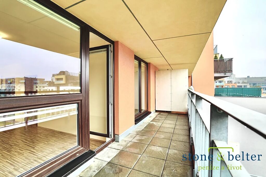 Dominantou bytu je prostorný balkon s jižní orientací po celé délce bytu, který poskytuje dostatek denního světla a ideální místo pro relaxaci či posezení.