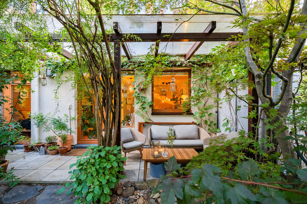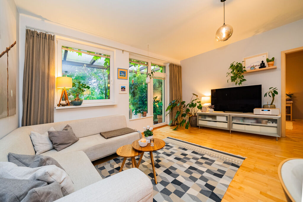 Přízemí bytu tvoří obývací pokoj se vstupem na terasu a dále do zahrady. Terasa je zastřešená a zvětšuje tak užitný prostor bytu. Zahrada je rovinatá se vzrostlými dřevinami, které poskytují nejen pocit, že jste součástí přírody, ale poskytují i velmi příjemné klima v přízemní části bytu. Obývací pokoj je prakticky propojený s jídelnou a kuchyňským koutem. Kuchyně je vybavená kuchyňskou linkou se spotřebiči. Dále je zde prostorná ložnice s vestavnými skříněmi. Z ložnice je také umožněn přístup na terasu. Samozřejmostí je koupelna se sprchovým koutem a toaletou. Velmi příjemný je fakt, že ze zahrady vede branka k zadní přístupové cestě, na kterou se dostanete pohodlně autem, což je velmi praktické v rámci zásobování či stěhování.