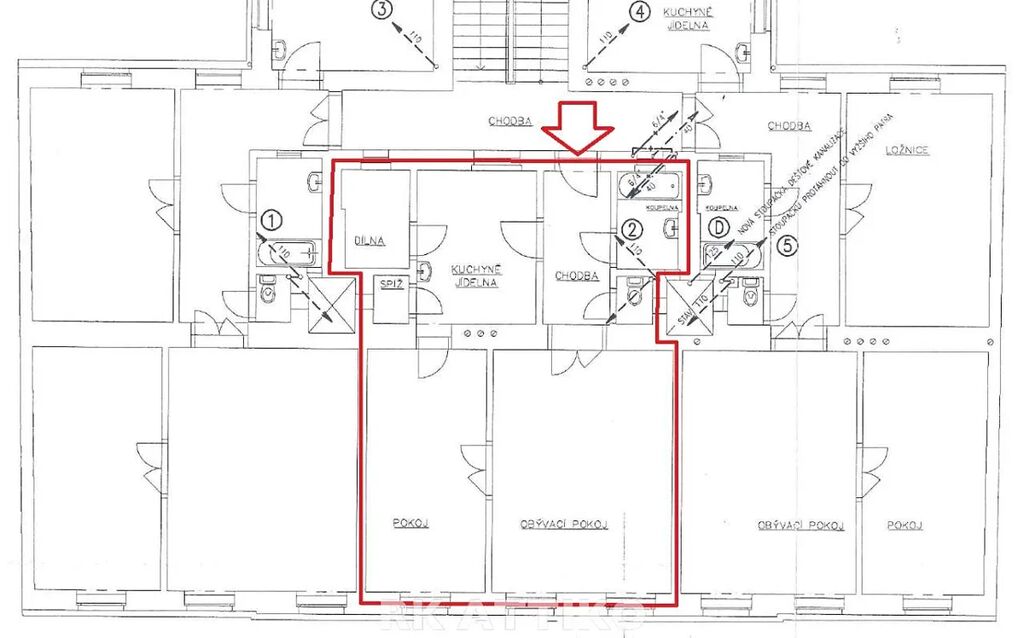 Byt má dva pokoje 26+17 m2, kuchyň 11 m2, u kuchyně komoru 3,7 m2 a spíž 1 m2, předsíň, koupelnu 3,7 m2 a samostatné WC.