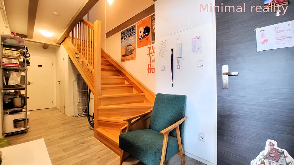 Byt je dispozičně dobře řešený. Z prostorné chodby je vstup do kuchyně, dvou pokojů, koupelny a samostatné toalety. Po dřevěném schodišti vystoupáme do třetího pokoje.