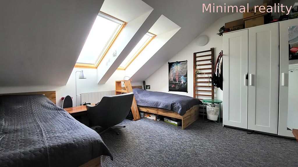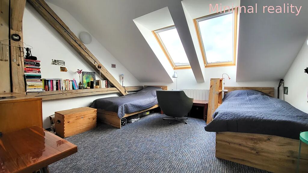 Z chodby s botníkem, věšákem a zrcadlem je vstup po dřevěném schodišti z masivu do třetího podkrovního pokoje. Pokoj je od schodiště oddělen posuvnými dveřmi a je vybaven dvěma postelemi a pracovními stoly.