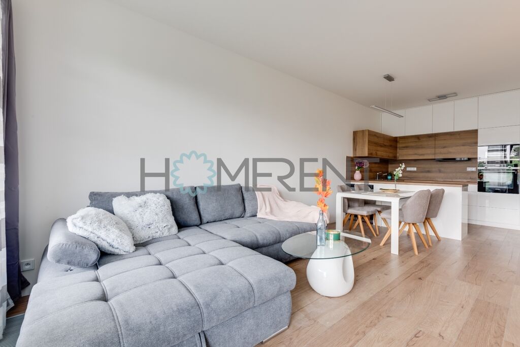 Dispozici tvoří obývací pokoj s plně vybavenou kuchyní, ložnice s vestavěnou skříní, elegantní koupelna se sprchovým koutem a pračkou a oddělené WC.
