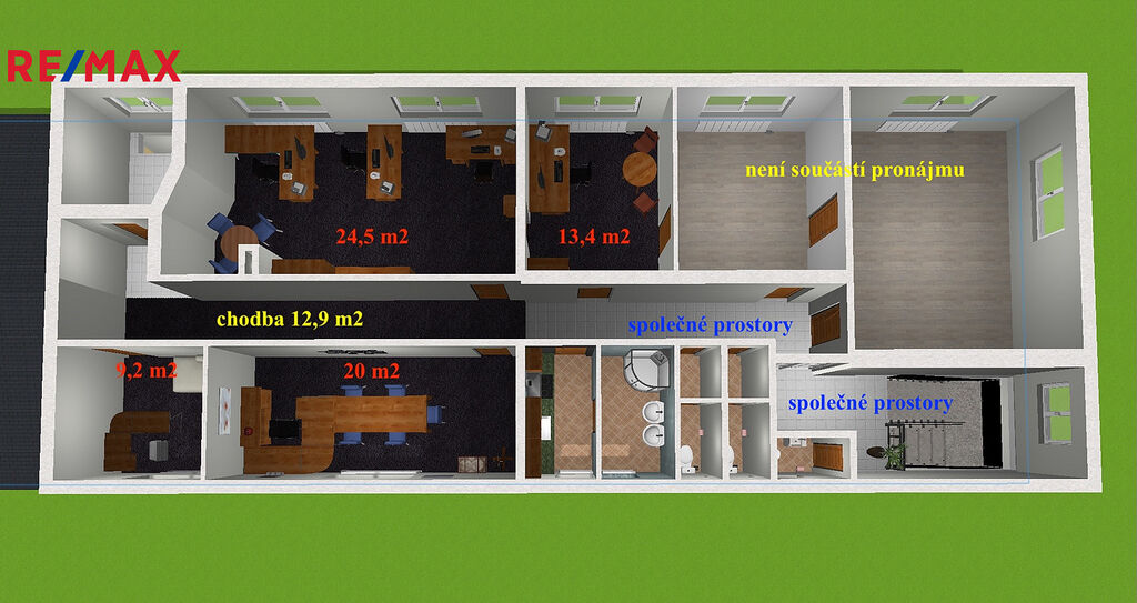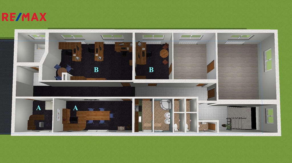 V případě zájmu je možné využít i kanceláře v 1. patře budovy (dle půdorysu A+A o výměře 29 m², jsou součástí samostatného inzerátu) nebo kanceláře B+B, výměra 38 m² (taky samostatný inzerát).