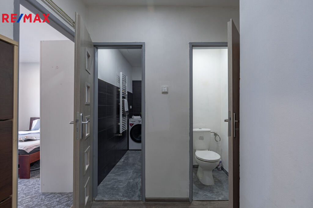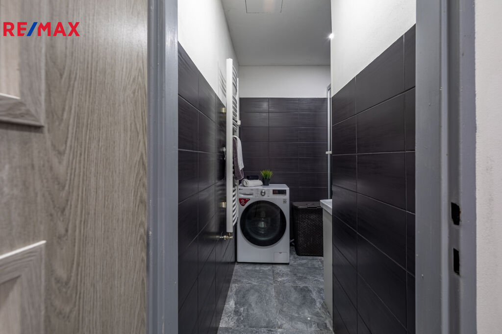 ✅ Zvětšená koupelna se sprchovým koutem, moderní obklady, dlažba, místo pro pračku ( pračka není součástí prodeje)