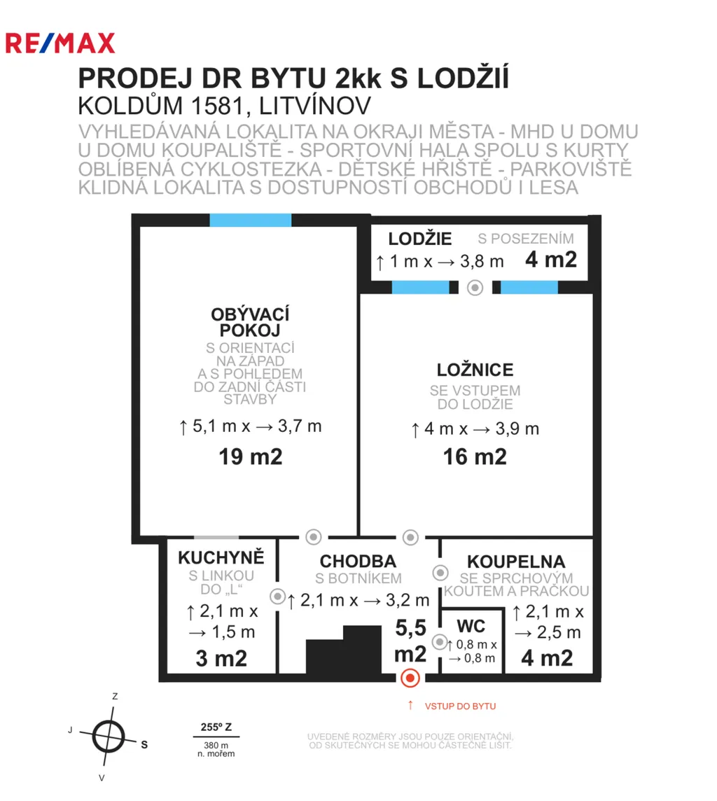 ✅ Dispozice 2+kk s lodžií, užitná plocha 52,5 m² (včetně lodžie). obývací pokoj, kuchyňský kout s výdejním oknem do obýváku, ložnice.