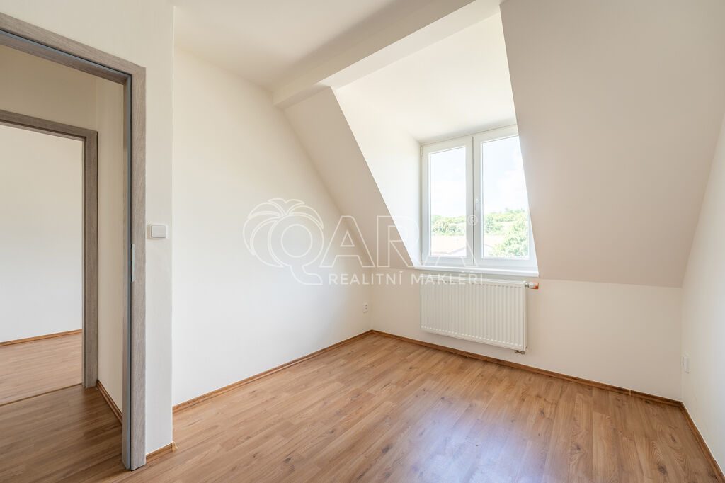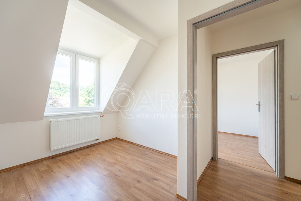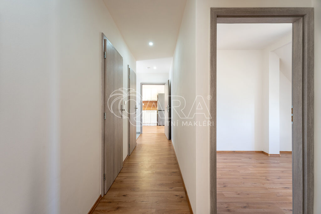 Bytová jednotka o podlahové ploše 63 m² se nachází ve 2. nadzemním podlaží cihlového domu. Skládá se z chodby o výměře 9,95 m², ze které jsou přístupné všechny místnosti, které jsou vzájemně neprůchozí. Kuchyně je spojená s obývacím pokojem a součástí je nová kuchyňská linka se spotřebiči (elektrickou troubou, varnou deskou, digestoří, lednicí s mrazákem i vestavěnou myčkou). V obývacím pokoji je příprava na krbová kamna. Dále jsou k dispozici tři samostatné pokoje. Koupelna je vybavena vanou, umyvadlem se skříňkou a zrcadlem. Přípojka na pračku je samozřejmostí, pračka nebude součástí nájmu. WC je samostatně.