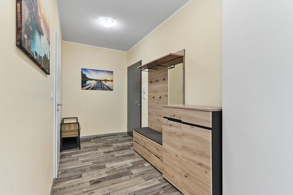 Kuchyňská linka na míru (trouba, varná deska, myčka, digestoř). Ložnice - vestavěné skříně, manželská postel. Koupelna - pračka, sušička, umyvadlová skříňka. Obývací kout - rohová pohova, pohodlné křeslo, barové (jídelní židle) knihovna, komoda, konferenční stolek a televizor. Chodba - komody, botník s věšákem.