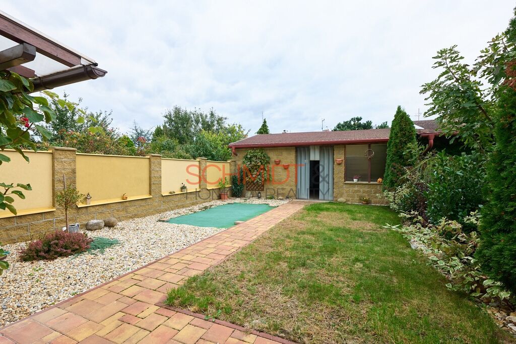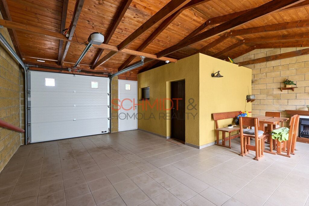 Do zahrady se dostaneme dvěma způsoby. Jedna cesta vede ze suterénu, druhá z jídelny v přízemí domu. V zadní části zahrady stojí prostorná garáž o zastavěné ploše 59 m² s krytým posezením u elektrického krbu a uzamykatelnou místností vhodnou například k uskladnění jízdních kol, lyží a podobně.
