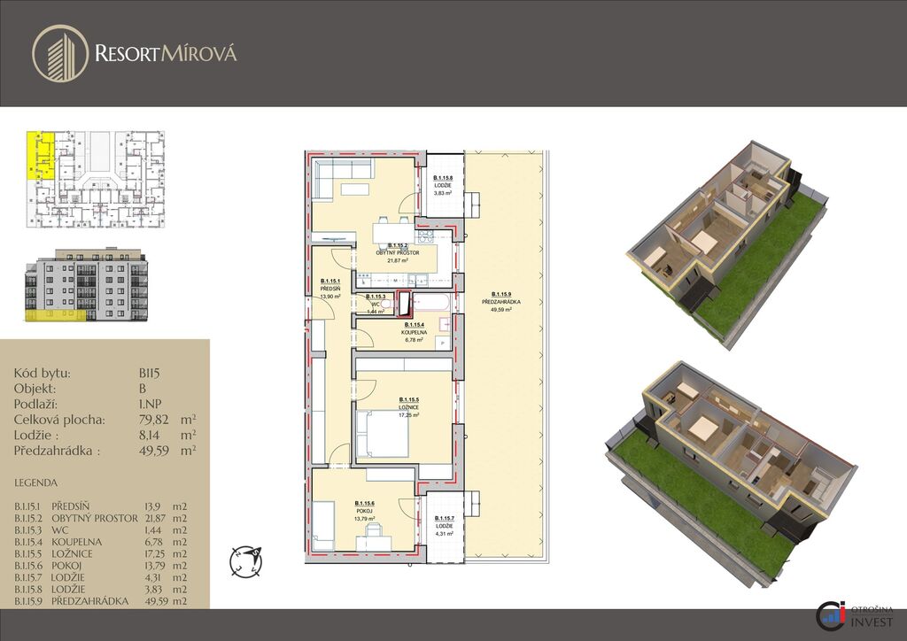 Nabízíme vám k prodeji bytové jednotky o dispozici 3+kk o velikosti 79,82 m² + lodžie o velikosti 8,14 m² + předzahrádka 49,59 m² v novostavbě projektu Resort Mírová. Tyta bytová jednotky se bude nacházet v 1. nadzemním podlaží. Bude situovaná na severovýchod.