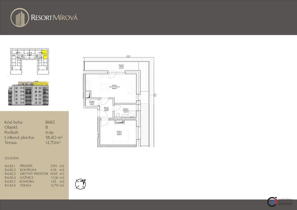 Nabízíme k prodeji byt 2+kk o velikosti 58,40 m² + terasa o velikosti 12,70 m², umístěný v novostavbě projektu Resort Mírová. Byt se nachází ve 6. nadzemním podlaží.