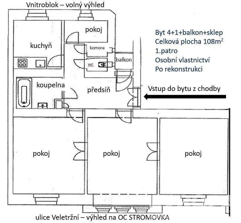 Exkluzivně nabízíme prodej světlého luxusního bytu 4+1 v prvorepublikovém domě ve Veletržní ulici, Praha 7. Nevšední byt o celkové užitné ploše 108 m², situovaný v prvním patře činžovního domu z roku 1945 prošel kompletní nákladnou rekonstrukcí před cca 5ti lety s respektováním historických prvků (dvoukřídlé dveře, dubové parkety,..) včetně oken, dveří, obložení, podlah, vytápění včetně těles po bytě, rozvodů, koupelny a sanitárního vybavení, kuchyně. Náklady rekonstrukce byly téměř 3miliony Kč. Byt se prodává včetně vybavení dle foto. Koncepce bytu je ideální, z prostorné haly vcházíte do téměř všech místností (3 pokoje, koupelna, kuchyň, WC, technická, balkon) byt by umožňoval i vícegenerační bydlení. Byt kromě prostorné haly tvoří 3 velké a 1 malý pokoj, samostatná kompletně vybavená prostorná kuchyň s moderními spotřebiči, koupelna s vanou, sprchovým koutem a novým kotlem, samostatné WC, samostatnou komoru a malý balkon. K bytu náleží i prostorný sklep. Byt má část oken do ulice a část do dvora, je perfektně větratelný a světlý. Parkování pro rezidenty Prahy 7 je umožněno v OC Stromovka za zvýhodněných podmínek.