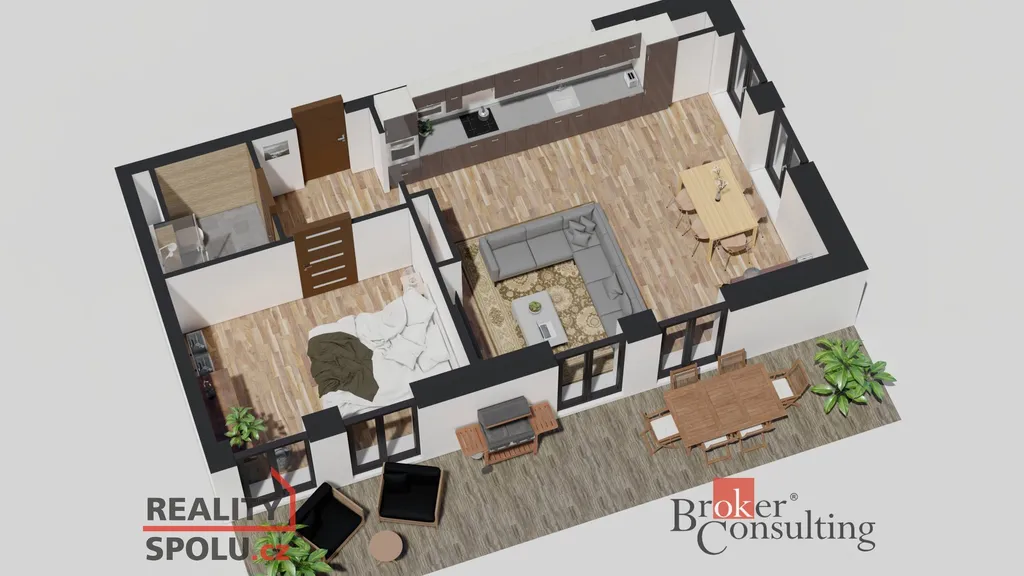 K bytu náleží prostorná terasa o výměře 43,48 m² a přímý vstup na vlastní zahrádku, ideální pro relaxaci nebo rodinné posezení.