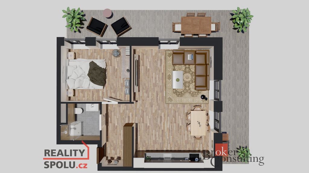 Byt disponuje prostornou terasou o velikosti 36,46 m² a přímým vstupem na vlastní zahradu, což ocení rodiny i milovníci soukromí.
