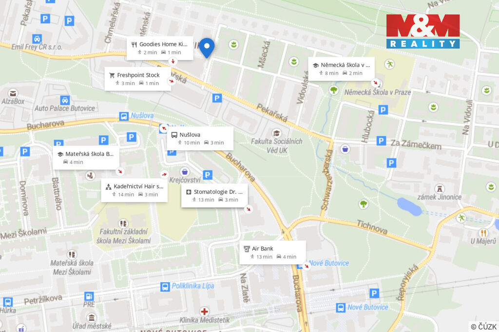 Německá škola 500 metrů, zastávka autobusu 2 minuty chůze, stanice metra Nové Butovice nebo Hůrka 10 minut chůze, park Vidoule/Cubulka.