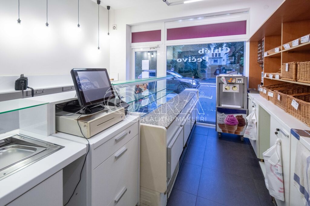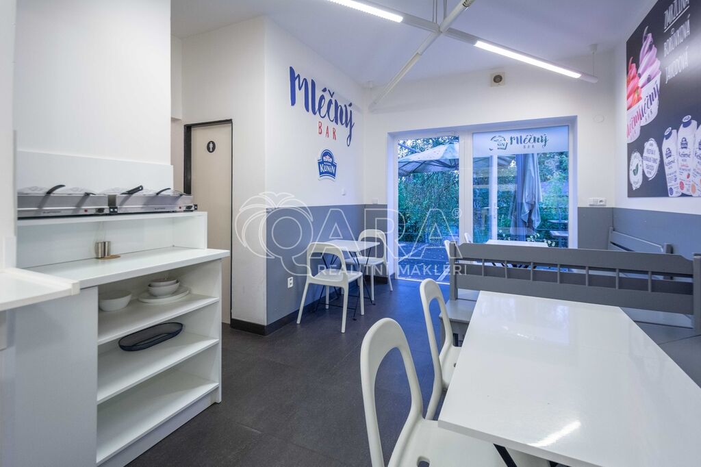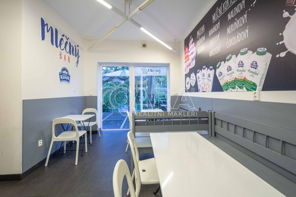 Dispozice prostoru zkolaudovaného jako občerstvení, původně pizzerie: prodejna s výlohou do ulice, stolky s posezením, dámské a pánské WC. V zázemí kuchyně / přípravna s výdejním okénkem do ulice, WC pro personál a skladové prostory. V přední i zadní části terasa (11 m2 + 32 m2).