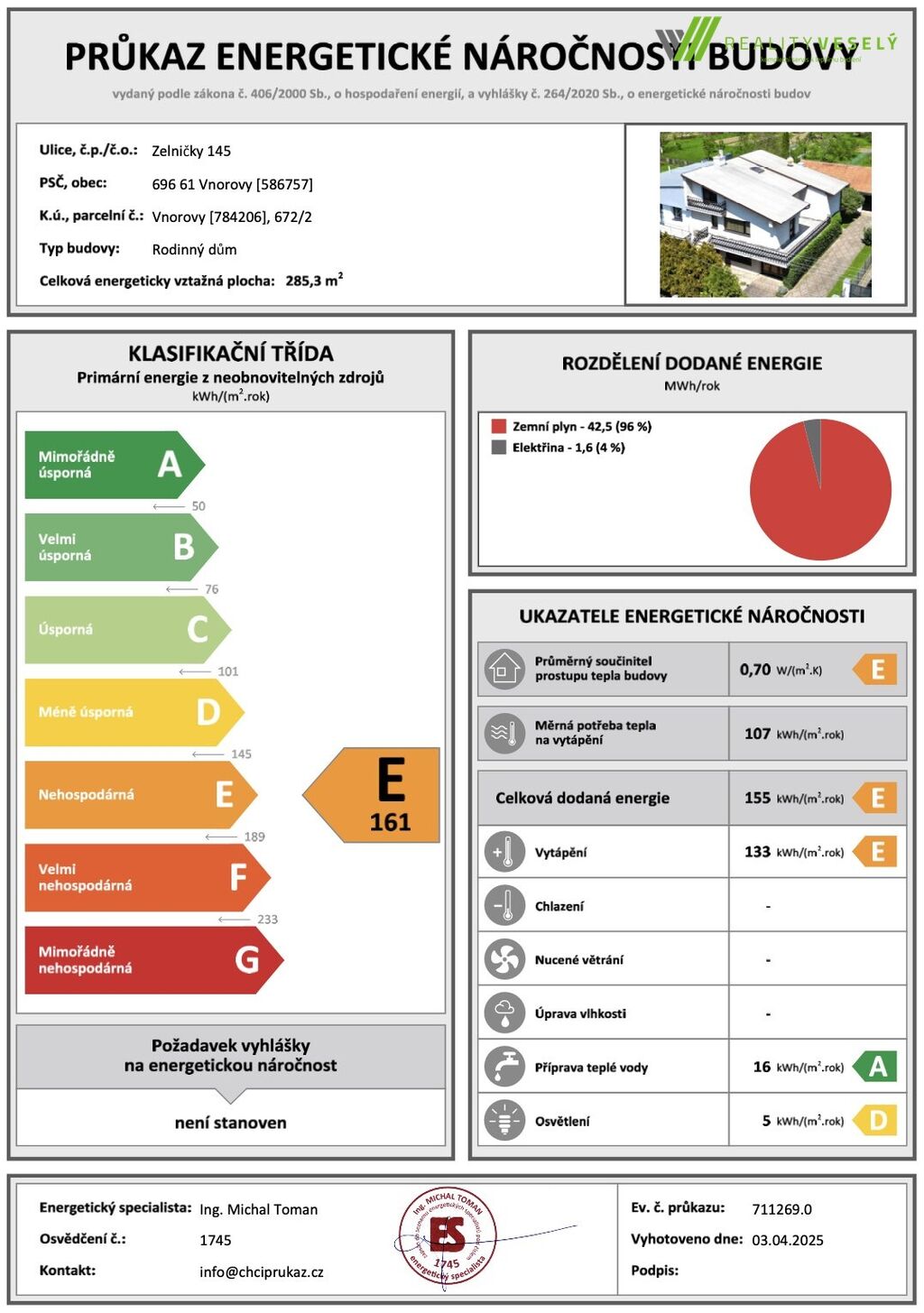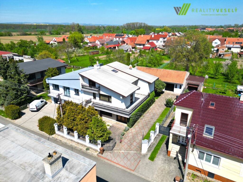 Ve výhradním zastoupení majitelky nabízíme k prodeji velkoryse navržený dvoupodlažní rodinný dům s obytným podkrovím v obci Vnorovy, dispozičně 7+1. Zastavěná plocha 124m2. V zadní části pozemku stavba technického vybavení – velká hala, zastavěná plocha 119m2 (původně sloužila jako dílna pro kovovýrobu, později se firma úspěšně rozšířila a byla přesunuta jinam), možno využít jako garáž popřípadě k podnikatelským účelům – dílna, skladiště, autoopravna. Dispozice domu: 1NP – velká vstupní místnost, pokoj pro hosty, WC, odkládací místnost, kotelna. 2NP – schodiště, obytná hala, obývací pokoj, ložnice, kuchyň, koupelna, WC, vstup do patra možný i z venkovního schodiště. Podkroví – 2 pokoje, WC, odkládací půdní prostor. Kolaudace domu proběhla v roce 1991. Střecha – krov, krytina Fatrafol , výměna v roce 2019, vytápění centrální plynové, 1.NP - radiátory, 2.NP - podlahové topení. Plynový kondenzační kotel vyměněn v roce 2014, ohřev vody – plynový bojler. Elektřina v mědi. Okna vyměněna za plastové – pouze na terasu zůstala původní kovová. Plot z kovových profilů – kovářské provedení. Na pozemku vlastní studna. Dům se nachází v klidné části obce nedaleko cyklostezky kolem Baťova kanálu. V obci veškerá občanská vybavenost – obchod, mateřská školka, základní škola, koupaliště, tenisové a volejbalová kurty, fotbalový stadion. Rádi Vám pomůžeme s financováním této nemovitosti. Pro více informací a prohlídky volejte makléři.