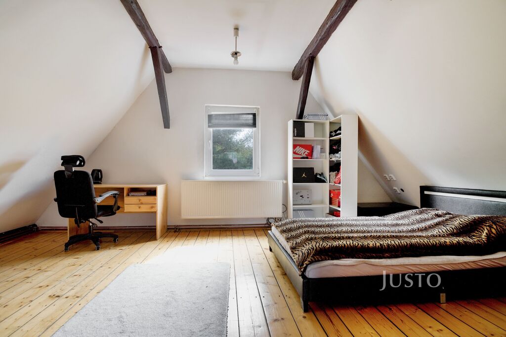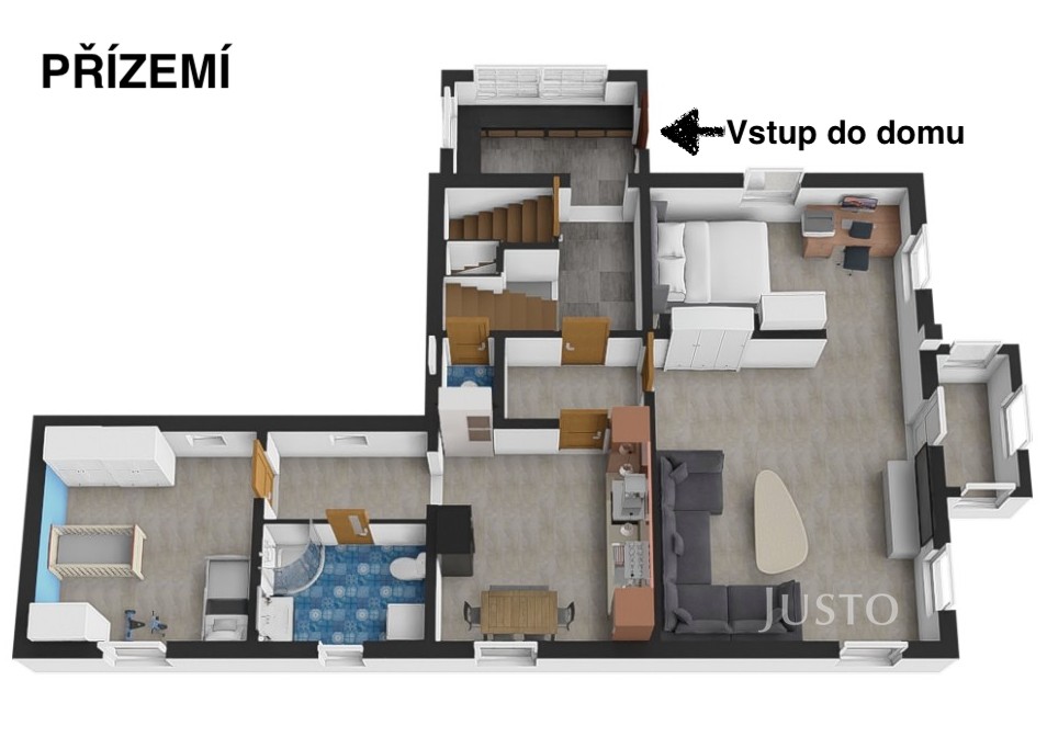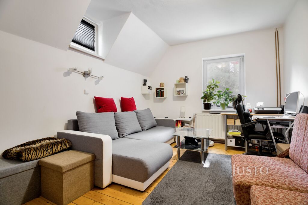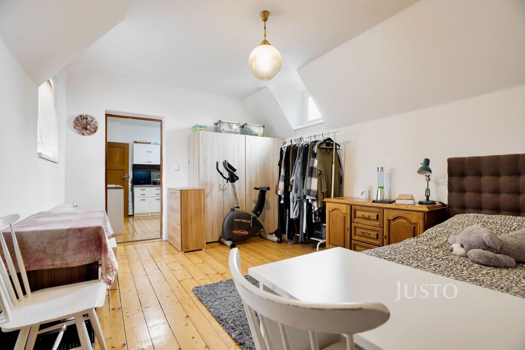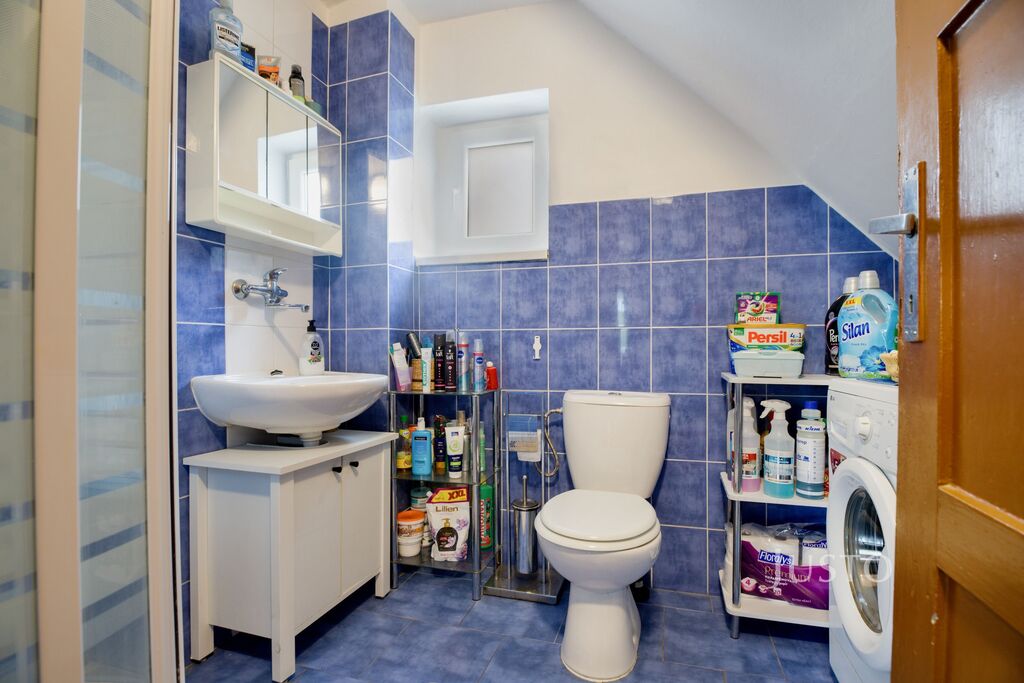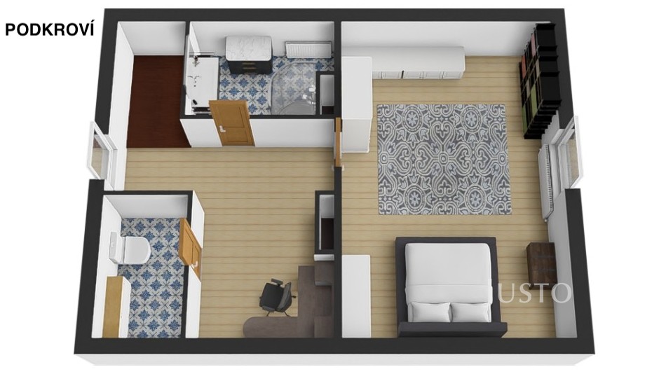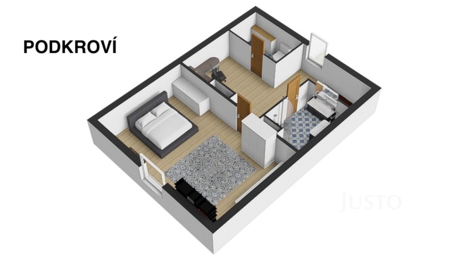 V podkroví se nachází větší místnost, pracovní kout, koupelna se sprchovým koutem a samostatnou toaletou.
