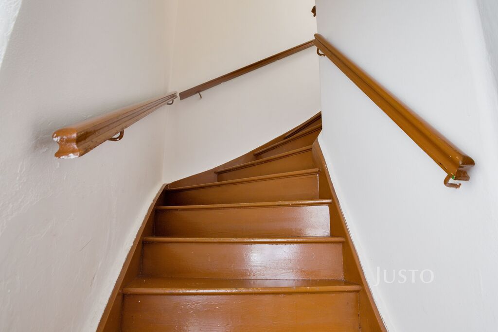 V mezipatře je toaleta. Patra mají své vstupy do bytů z centrální chodby, které spojuje schodiště.