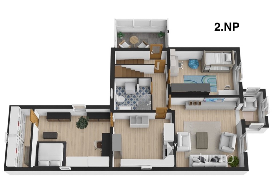 Ve druhém patře se nachází 3 samostatné pokoje, relaxační prostor, kuchyň, koupelna se sprchovým koutem, toaletou a zasklenou terasou kde najdete kryté posezení.
