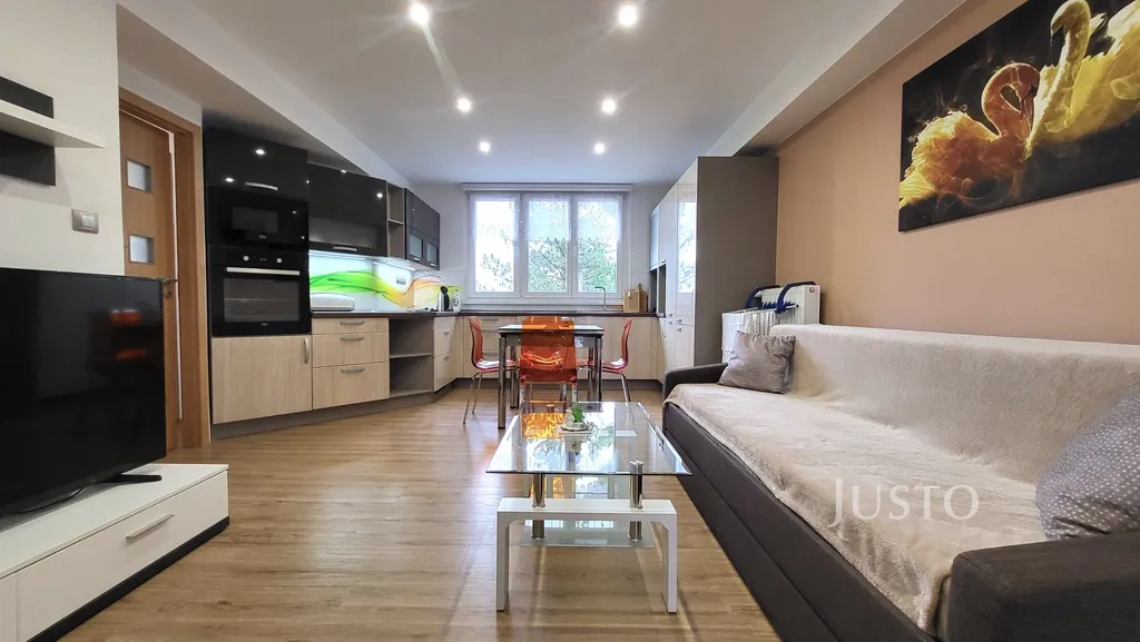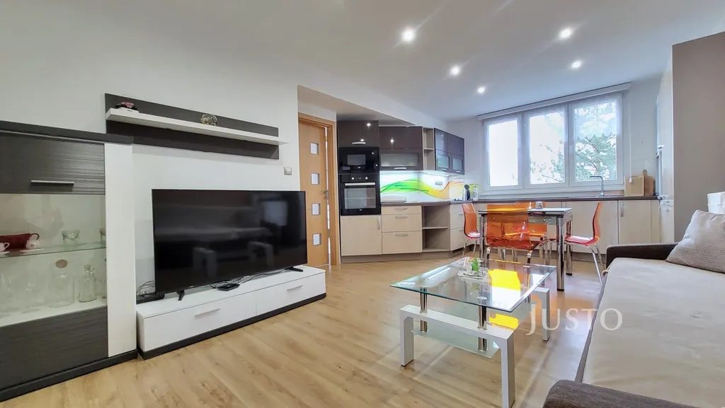 Obývací pokoj je s kuchyňským koutem. Kuchyňská linka je vybavena vestavěnými spotřebiči. Má dostatek pracovního a úložného místa. V obývací části je pohodlný gauč, konferenční stolek, televizní stolek atp.