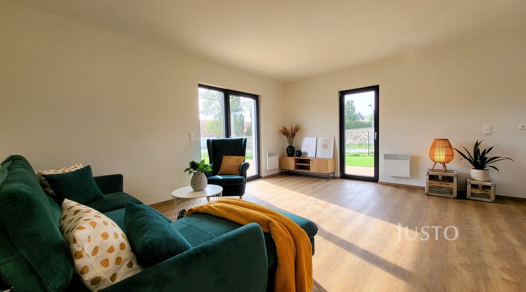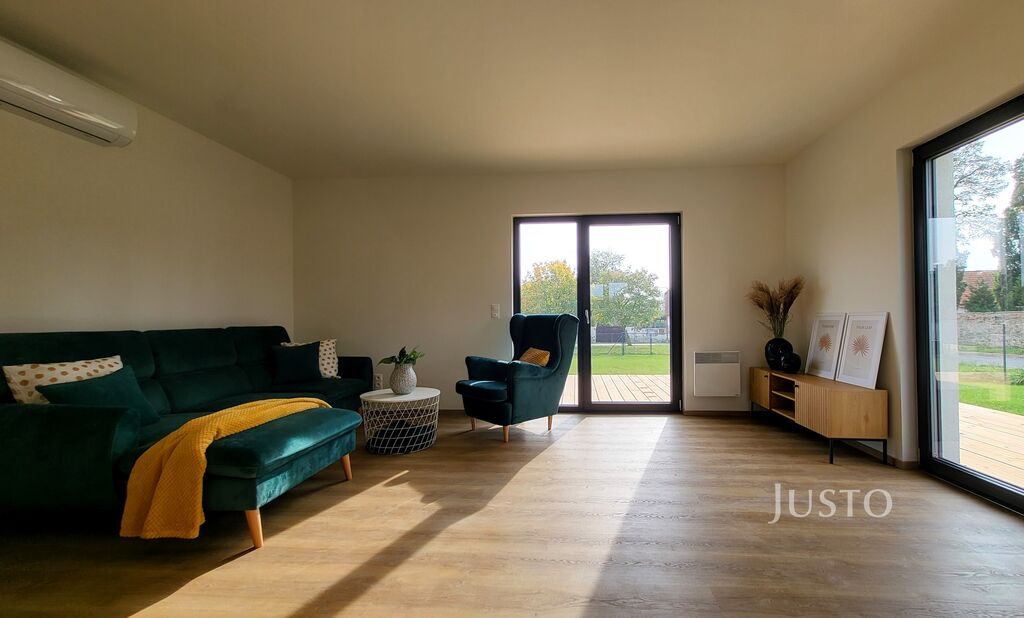 Obývací pokoj má dvě francouzská okna, kterými lze vstoupit na terasu, která je do tvaru L okolo domu. Díky těmto oknům je hlavní obytná část domu krásně prosvětlena a zároveň jistě oceníte pohodlné spojení s exteriérem domu. Nemusíte se však bát, že by díky velkým oknům bylo narušeno Vaše soukromí, jsou orientována do zahrady a komunikace, která vede za domem je dostatečně daleko.