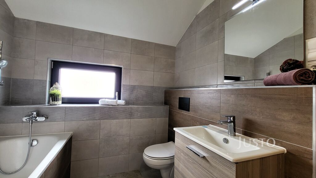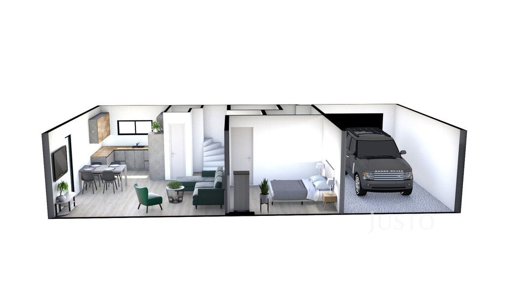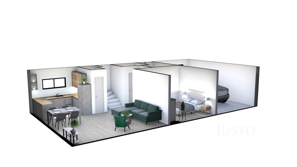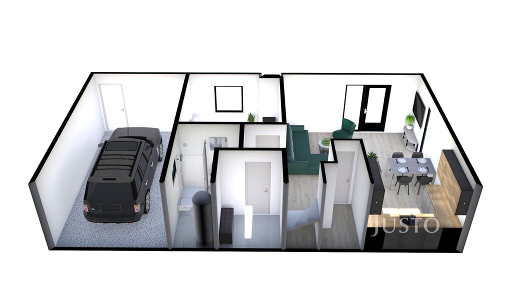 Dům je dispozičně řešen jako 5+kk se dvěma koupelnami, šatnou, garáží a terasou.
