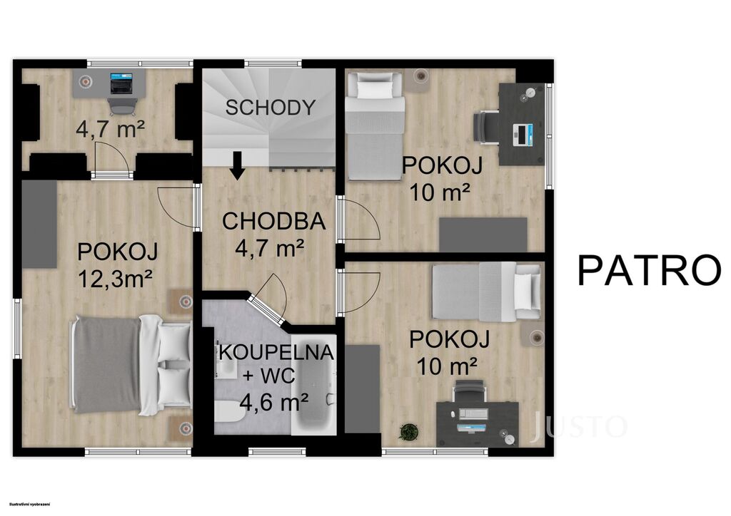 V podkroví jsou tři samostatné ložnice, pěkné prostorné místnosti, žádné krcálky. Jedna ložnice má navíc šatnu, tu však lze díky oknu využít např. jako pracovnu.