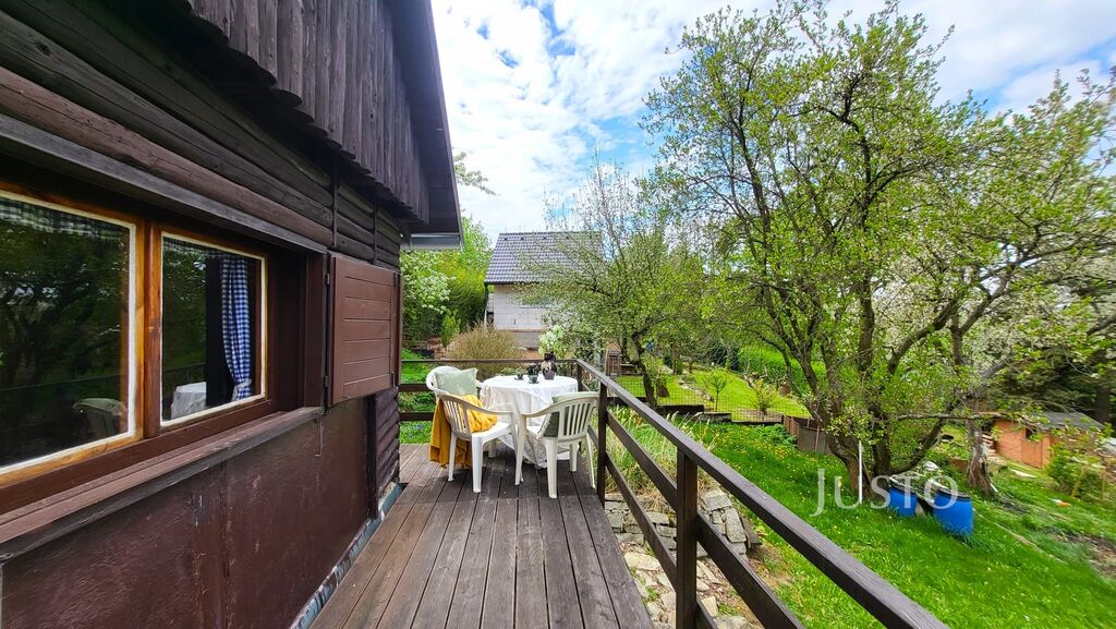 Kolem chaty je terasa s krásným výhledem do krajiny s venkovním posezením.