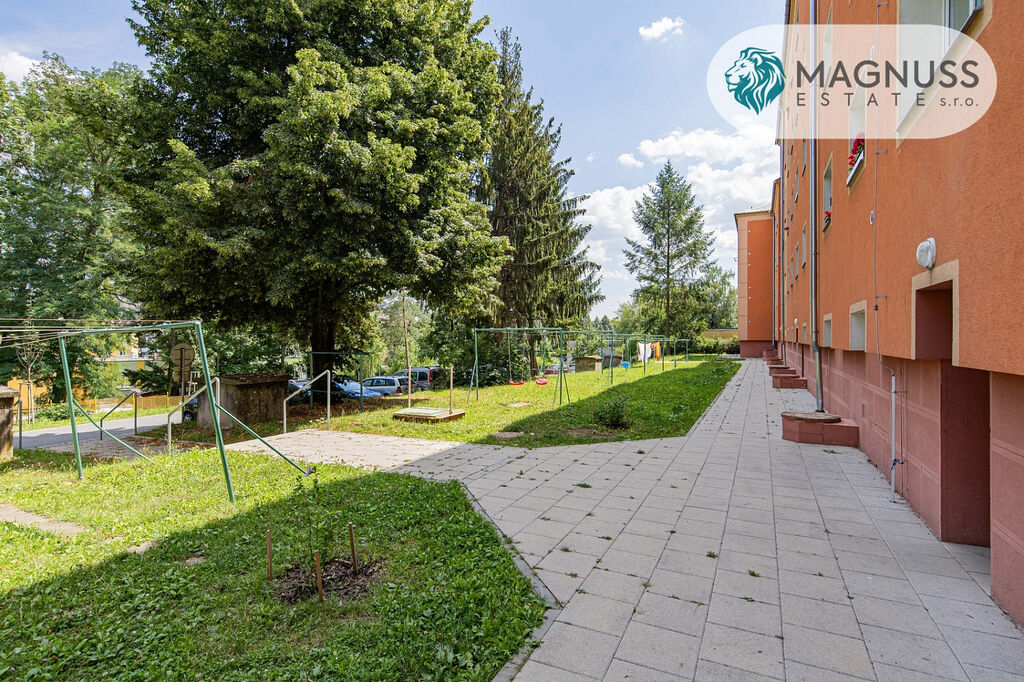 Dispozice: tři samostatné pokoje (cca 15 m²), kuchyň (9 m²), koupelna, WC, předsíň. K bytu náleží dva sklepy (každý cca 12 m²). Vhodné pro 3–6 studentů. Za domem je travnatá plocha a pohodlné parkování.