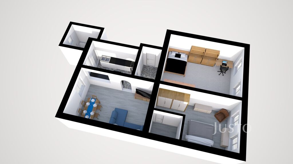 V zastoupení majitele nabízíme k prodeji byt o dispozičním řešení 3+kk na ul. Jeronýmova v Písku. Byt se nachází ve 2. NP domu. Před vstupem do bytu je praktická spižírna. Při vstupu do bytu je předsíň, ve které je místo na botník a předsíňový nábytek. Po pravé straně bytu s orientací do zahrady je kuchyňský kout a obývací pokoj. Tento útulný, praktický prostor vznikl přestavbou původní dispozice 2+1. Kuchyňský kout je od jídelní části a obývacího pokoje oddělena příčkou s průhledem, což dělá prostor vzdušným a světlým. Koupelna s oknem je s vanou a toaletou dohromady. V koupelně je tři roky starý plynový kotel, který zajišťuje vytápění bytu a ohřev vody. Vytápění bytu lze řešit i krbovou vložkou v obývací části. Dvě ložnice o výměře 23,3 m² a 17,1 m² jsou orientovány do ulice Jeronýmova. Menší ložnice má vestavěnou, velmi praktickou šatnu o výměře 2,9 m².